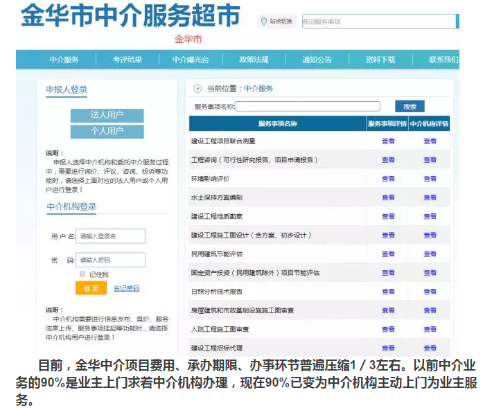 目前,金華中介項目費用、承辦期限、辦事環(huán)節(jié)普遍壓縮1/3左右。以前中介業(yè)務的90%是業(yè)主上門求著中介機構(gòu)辦理,現(xiàn)在90%已變?yōu)橹薪闄C構(gòu)主動上門為業(yè)主服務。