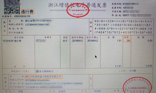 辦理ETC的用戶開具的發(fā)票有下面幾種:a. 左上角標(biāo)識“通行費(fèi)”字樣,且稅率欄次顯示適用稅率或征收率的通行費(fèi)電子發(fā)票(以下稱征稅發(fā)票),如下圖: