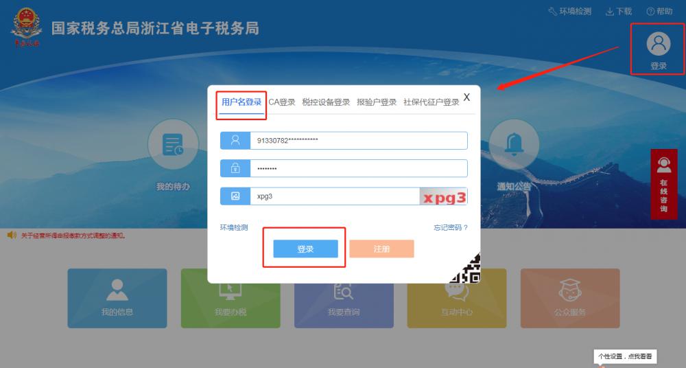 登錄浙江省電子稅務(wù)局(https://etax.zhejiang.chinatax.gov.cn),點(diǎn)擊主頁(yè)右上角【登錄】按鈕,選擇用戶名登錄,輸入賬號(hào)、密碼、驗(yàn)證碼,點(diǎn)擊【登錄】進(jìn)入電子稅務(wù)局。如下圖所示: