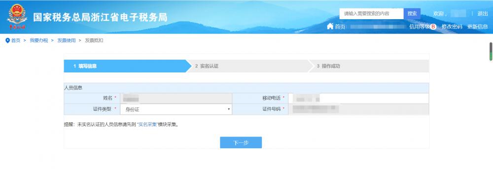 1.選擇在線辦理,進(jìn)入實(shí)名認(rèn)證環(huán)節(jié),人員信息默認(rèn)當(dāng)前登錄用戶(即頁(yè)頭右上角顯示的用戶名),確認(rèn)實(shí)名人員的基本信息后點(diǎn)擊【下一步】,如下圖所示: