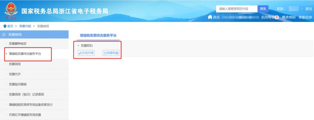 進(jìn)入【我要辦稅】-【發(fā)票使用】-【增值稅發(fā)票綜合服務(wù)平臺(tái)】-【發(fā)票抵扣】,如下圖所示: