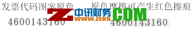 發(fā)票各聯(lián)次左上方的發(fā)票代碼使用防偽油墨印制,油墨印記在外力摩擦作用下可以發(fā)生顏色變化,產(chǎn)生紅色擦痕(如下圖所示)。